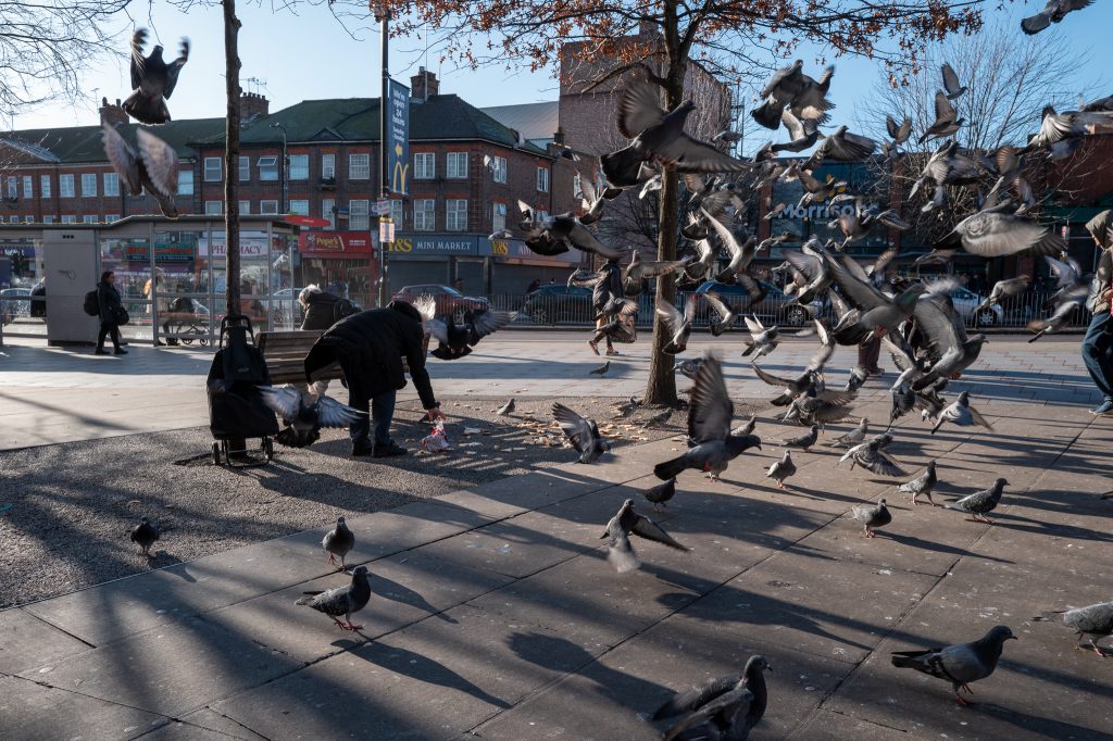 A walk onwards into the estate saw me stop for about ten minutes whilst watching a young French guy doing some parkour jumps from higher up to bounce of some lower walls and then land on the floor. I like watching skateboarding, parkour and other extreme sports where people show off skill and guts to do stuff that they probably shouldn’t. I know he was French, by the way, as I spoke with him briefly whilst he was patching up an open wound on his leg. It was about 14:45hrs now and as I continued the sun was dropping fast and creating some great shadows and contrast in the area so I did my best to capture as much as possible.
