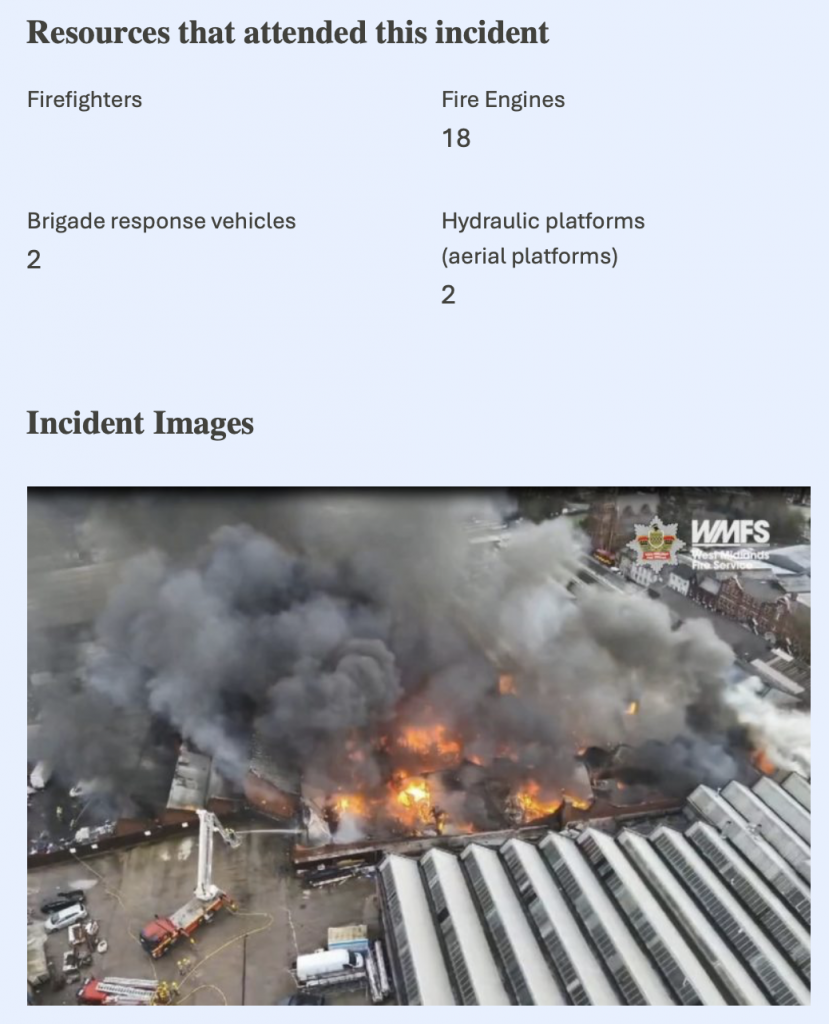 A couple of people told me that it started at 7:30 am and the West Midlands Fire Service website also said the same. It was a factory fire on Sunbeam Street and looking on Google Maps I could see a costume clothing factory but not a lot else. Two different bystanders told me it was a Clothing factory and a Car Parts factory so I guess it’ll wait ’til it’s on the news.