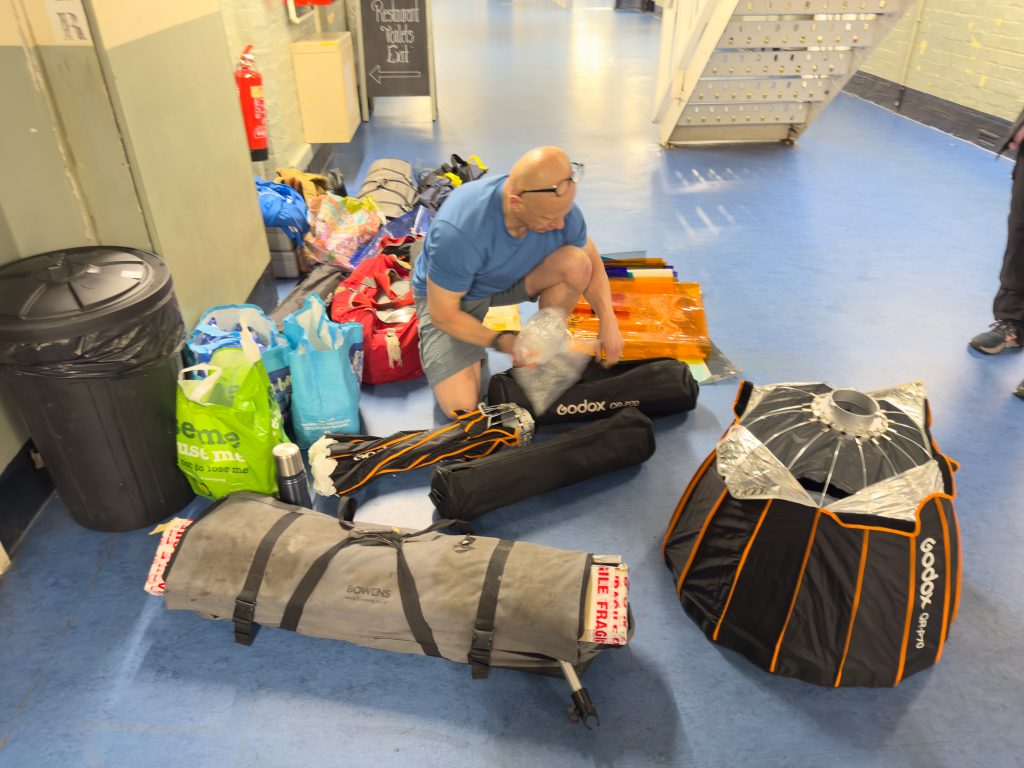 With this shot wrapped up it was time to break everything down and get it squirreled away into the correct bags before loading it all back into the car. The larger lights on C Stands were the heaviest and most awkward but it all packed up quite quickly, and I took a tour around the cells, kitchen and other areas where we had been using the equipment to make sure nothing was left behind. Once it was tidied up we loaded it into Pete’s car and the only gear left was his video lighting which would be needed for the next part of the day.