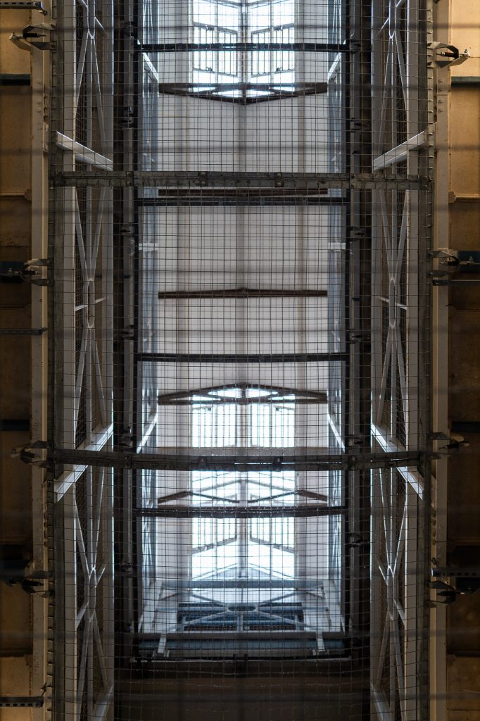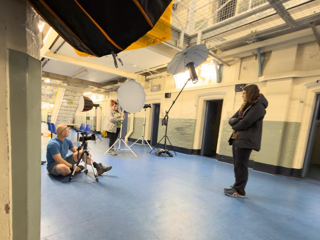 All the time these shoots were happening there were many groups of people moving through the prison, lots of schoolchildren on tours as well as regular self guided visitors wandering through with their dogs etc. It was wisely chosen to move the kit into a side cell whilst we were using the main parts of it, this way it kept it safe and stopped the tripping up of innocent bystanders, as well as reducing the risk of expensive gear going missing. Then it was time to move upstairs, so Nikki and I went up onto the catwalk to break down the lights that were up there. They were not going to be needed for this next setup so we took them all down into the ground floor and left them in case they might be needed later.