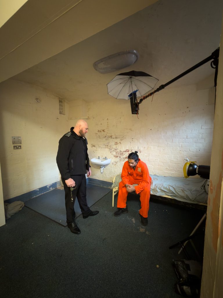 On this part of the shoot I was asked to carry the softbox out of the shot into a nearby cell where the CTO gel threw some warmer light onto the figures, making the orange pop, whilst the CTB on the boom overhead cooled down the overall scene. Nikki was in the cell opposite with the smaller honeycomb flash, also sporting a CTO gel.