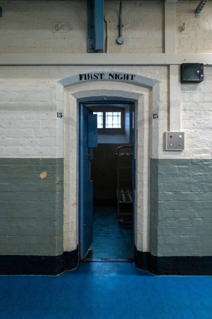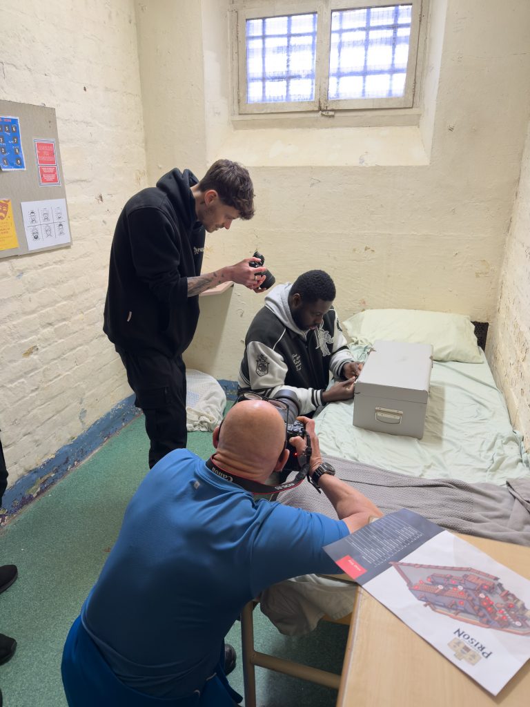 We unloaded a large number of bags and bits of equipment and take them through the cafe in the prison into the ground floor of A Wing. I spot about five backpacks full of Bowens lighting and cameras as well as a small rucksack for batteries. There are about six small light stands and some even larger light C stands. There are other bags full of mysterious goodies that we’ll no doubt find out about soon.
