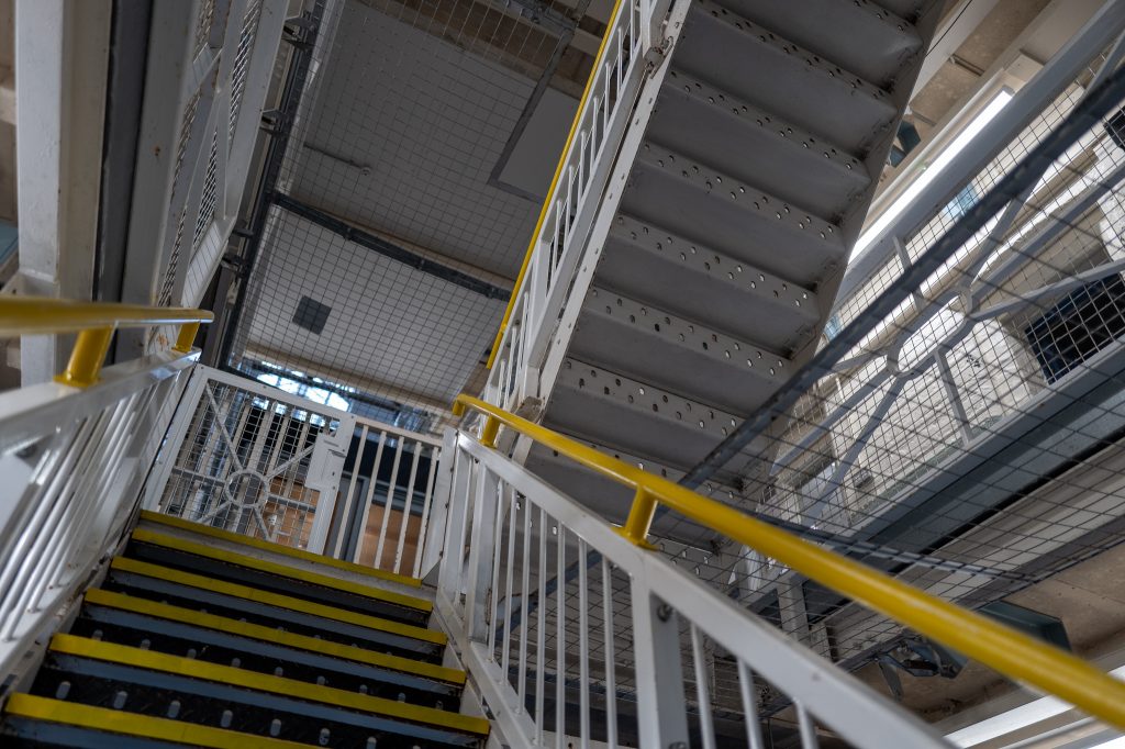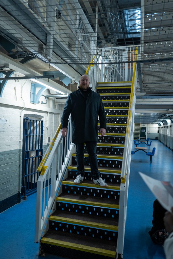 Then it was a swift move to the staircase that led up to the 1st floor or the “twos” as the staff in the prison referred to them. Chris was photographed on the stairs and then the inmates individually captured too, before the group shot showing the officer at the foot of the stairs and the inmates to the right side of the stairs. Again, I helped move the huge boom arm with the head on it closer to the action, and it was tricky lifting it up as there are anti-jumping meshes overhead on every floor. A fill light was moved in from the doorway on the right side, still with the CTO gel on it. I stayed away from the shot until Pete asked specifically for me to enter it, as far as I was concerned I was there as an assistant and not a model, so didn’t assume I should be in every shot.