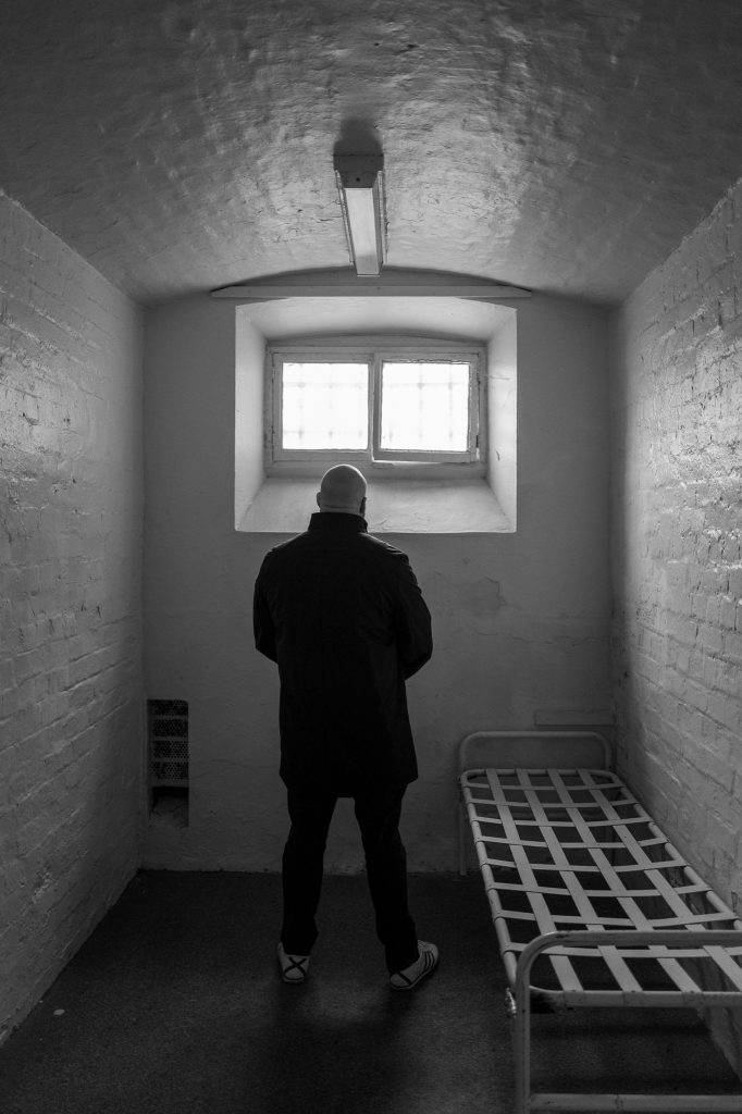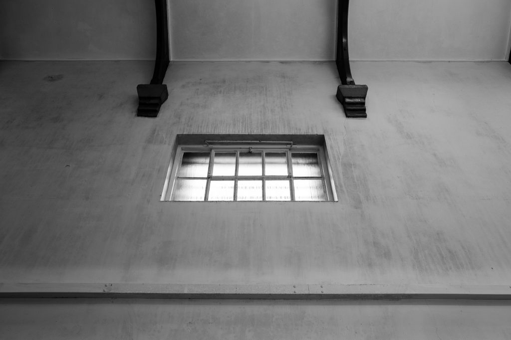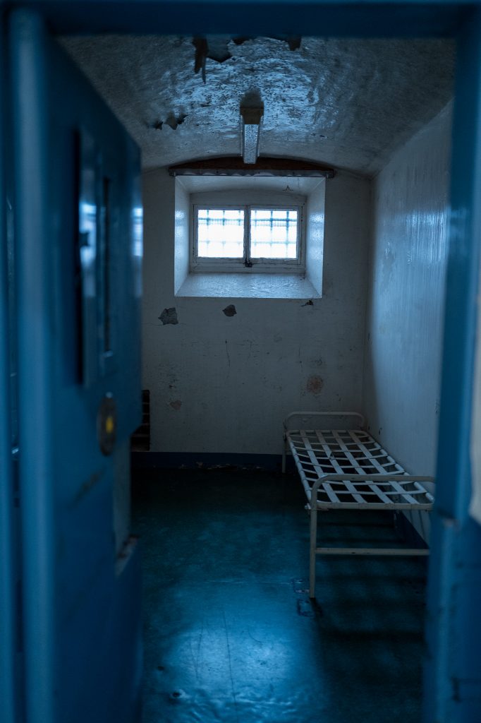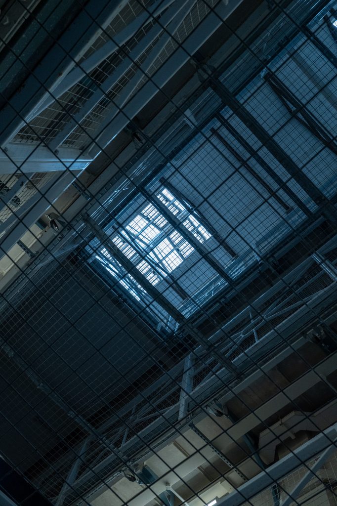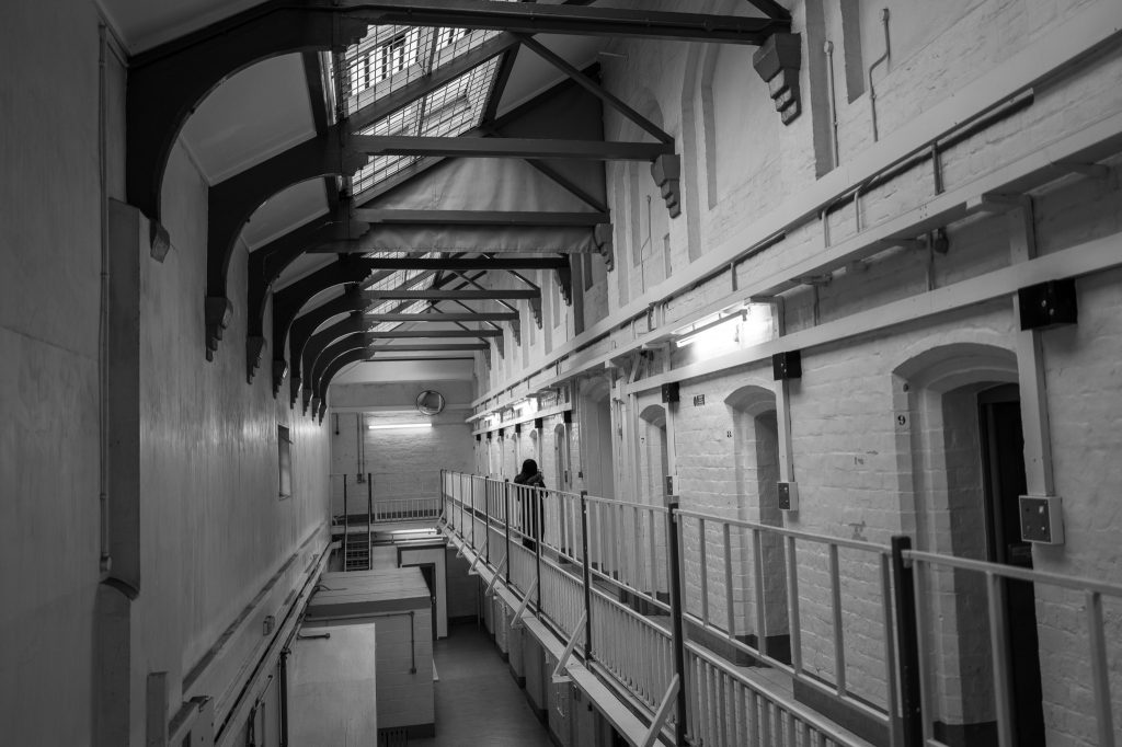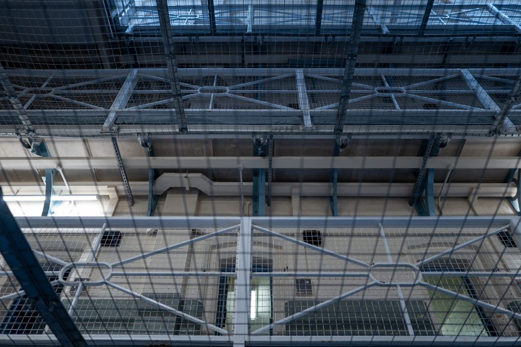 We went up on to the first floor landing where there are picnic/school style tables and chairs near a fence of solid bars. Here Pete had said he wanted photos of the inmates around the bars, which are pretty essential when you’re in a prison so it fit perfectly that this would be an area to visit. He’d been the day before to scope out some areas to shoot and had mate notes on the scenes and setups.