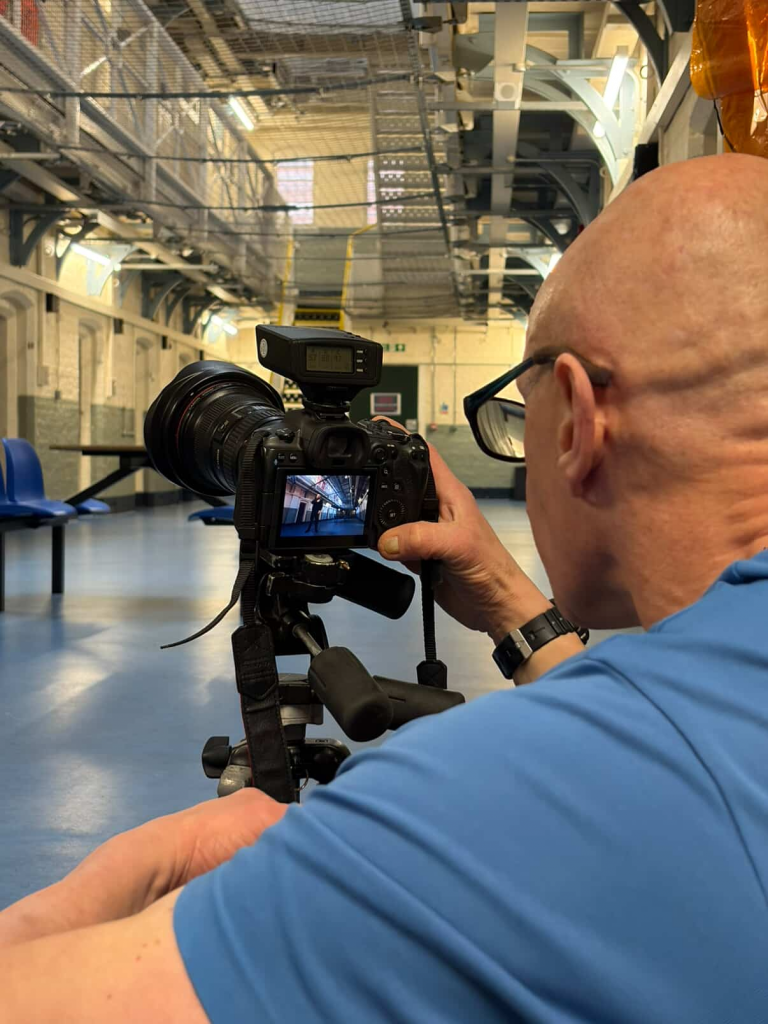 The camera Pete had mounted on the tripod was a Canon EOS R5 with an EF – 16-35mm L lens on the front of it. It appeared that the L lens was in an adapter to convert from the EF to an RF mount, and probably from his original kit bag when he would have been using Canon 5Ds or maybe even 1D, DSLRs. This 16-35 is a wide angle lens, one that I use for a lot of my architecture shoots and he was trying to capture the subjects in the environment of the prison. This lens does suffer from distortion for close ups though so portraits are not usually ideal with it. To overcome this issue Pete had a second R5 body with the 24-70 RF lens on the front and this was used for the more portrait like shots that would soon follow.