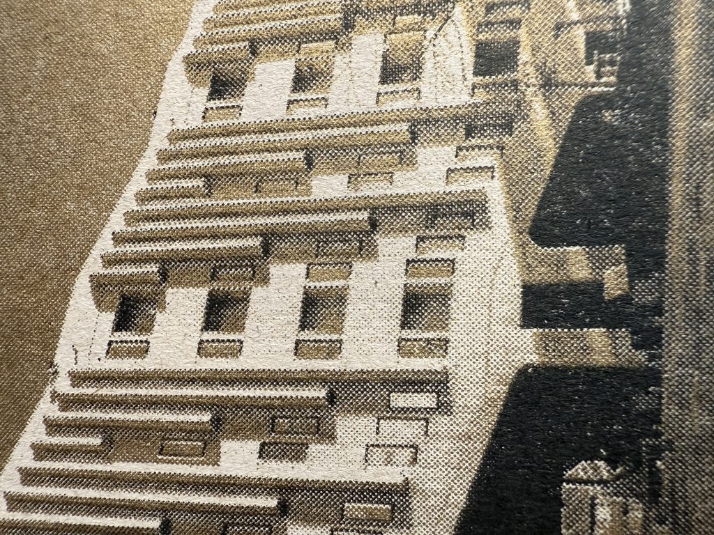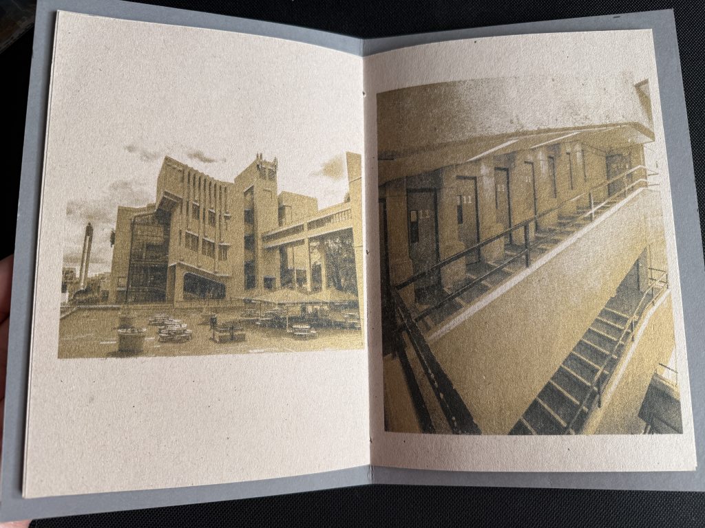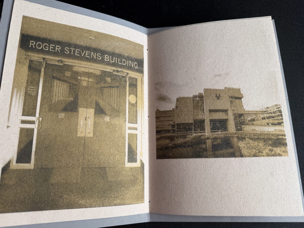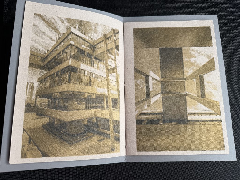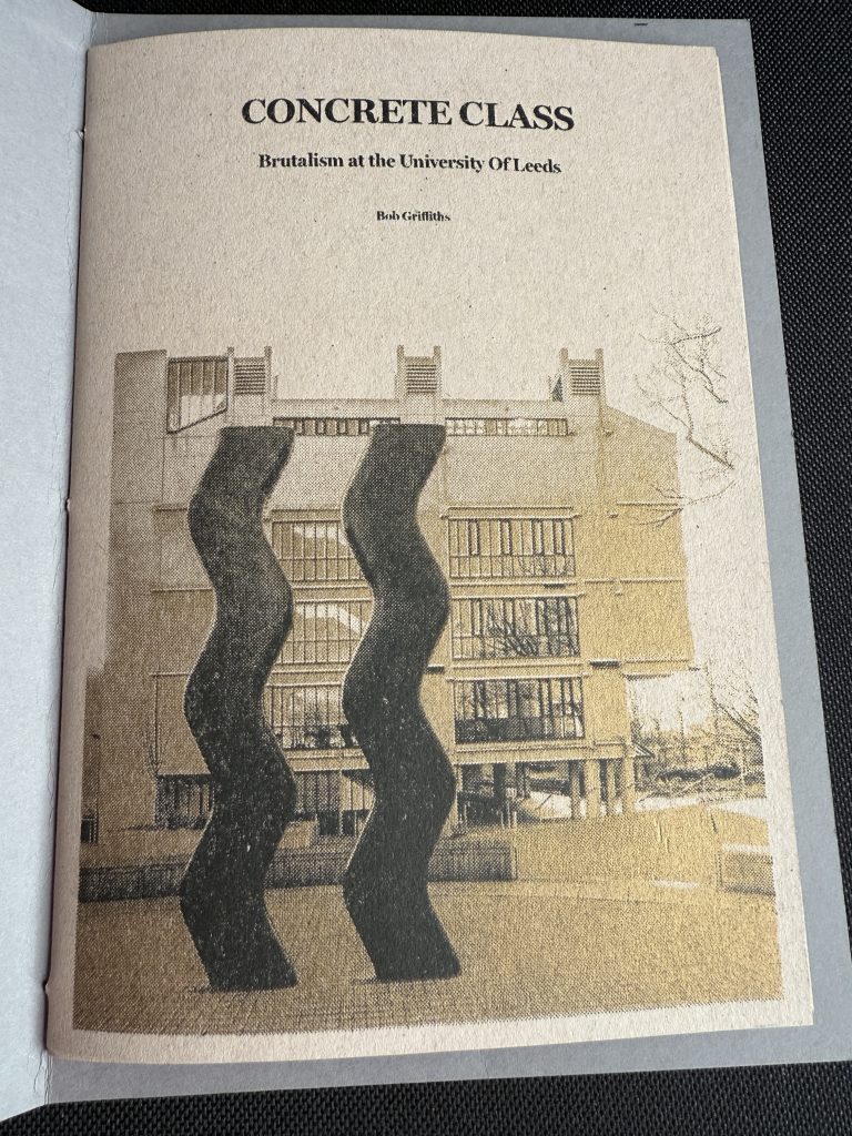 “Concrete Class” features 19 photographs, painstakingly arranged and printed using a risograph printer on 170gsm paper using Gold and Black inks. The whole thing is hand bound using binding twine and held inside a cardboard cover featuring a hand cut Lino print of the title. The result is a wonderful, hand made and very limited edition (20) of a zine featuring the iconic details from the University Of Leeds campus, starring the Roger Stevens building amongst the structures.